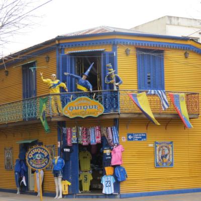 Départ en bus pour rejoindre le quartier populaire de la Boca, les amateurs de football savent certainement que le quartier abrite un des clubs les plus célèbres d’Argentine et d’Amérique du Sud, le Club Associatif de Boca Juniors (CABJ). La ligue d’Argentine de première division compte à ce jour 30 équipes. 13 sont des clubs de Buenos Aires ! Le stade de Boca, se nomme la Bombonera  d’une capacité de 37000 places. Le club rival est le River Plate jouant dans le stade Monumental d’une capacité de 75000 places champion sortant avec 35 titres pour seulement 24 au Boca ! Une grande partie des immeubles de la Boca sont peints aux couleurs du club, en bleu et jaune…
