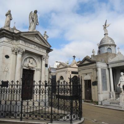 Je rejoins l’église et le couvent de la Recoleta (Nostra senora del Pilar) centre du quartier de la Recoleta avec son cimetière fort célèbre. En effet ce cimetière dessiné par Prosper Catelin, un architecte français en 1822, abrite de nombreuses tombes de célébrités argentines, écrivains, sportifs, hommes politiques et anciens présidents dont la tombe d'Evita Peron.
