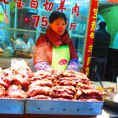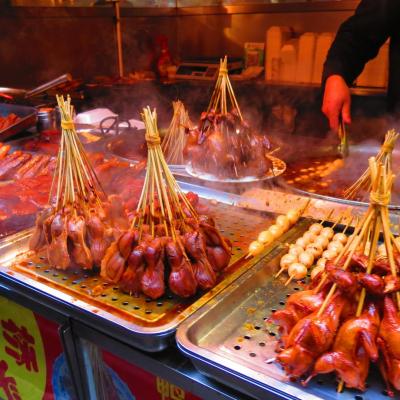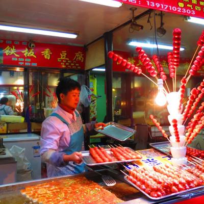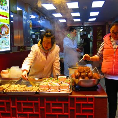 En effet l’étroite rue principale est bordée de part et d’autre d’une quantité incroyable de stands de bouches, vendant pâtisseries à base de riz gluant (Qibao Kao), des brochettes de fraises enrobées de sucre (Tanghulu), mais surtout une quantité de snacks assez ragoutants comme les Hebao Doufugan un tofu séché enveloppé dans des feuilles de lotus, des patates douces rôties (Kao Hong Shu), quantité de pieds de porc, de veau…. et des crapauds fumés (Xunlanhamo),… je ne peux tous vous les décrire tout comme l’odeur qui embaume la rue, mais j’en ai presque la nausée… Cela reste cependant un moment véritable, fort en couleur, olfactif et pour ma part réellement exotique ! En tout cas les chinois semblent raffoler de toutes ces spécialités culinaires ! Pour ma part je préfère sauter la case déjeuner… par chance j’ai pris un petit déjeuner copieux !