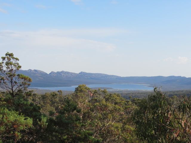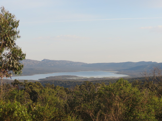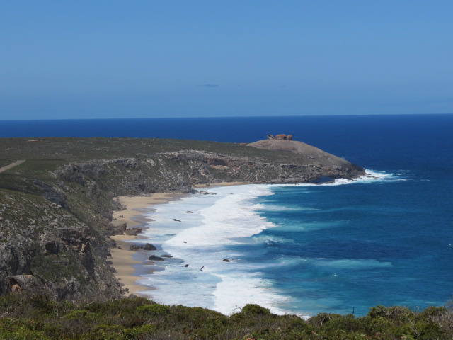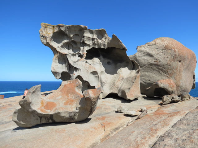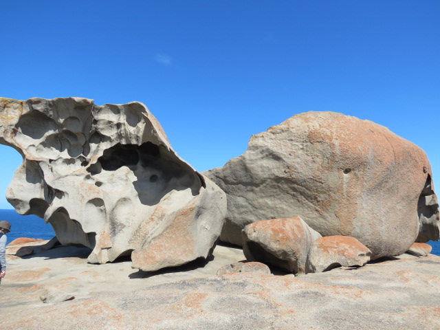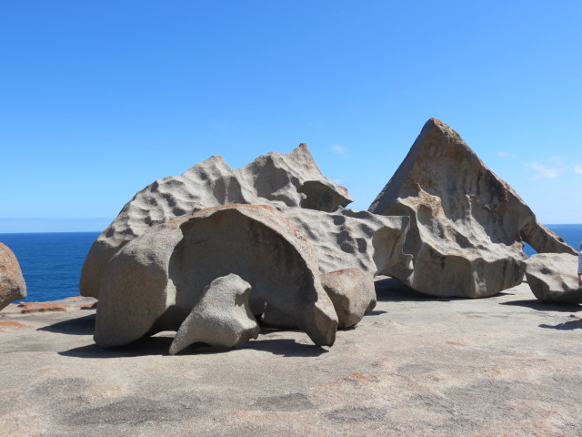 Nous sommes à présent en plein cœur du parc national, en plein cœur de la dense broussaille d’eucalyptus et la vue sur le littoral est superbe. Nous apercevons au loin les Remarkable Rocks (rochers remarquables…) des chaos granitiques sculptés par la force des vents qui leur ont donné des formes magnifiques et surprenantes. Ces rochers sont perchés sur un dôme de granite qui surgit de l’océan.