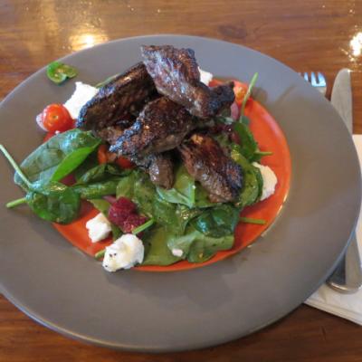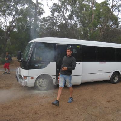 Sur la descente nous ramenant au village de Halls Gap, un bruit soudain et une fumée sort de l’avant du bus. Nous évacuons rapidement le bus, Matt éteint rapidement le départ de feu, les freins à disque ont rendu l’âme…. Par chance nous sommes à deux pas du village au niveau du terrain de cricket déserté par les kangourous. Le temps que Matt puisse gérer la situation et trouver un véhicule de remplacement pour rentrer sur Adelaïde, c’est l’heure du déjeuner. Ce sera salade de kangourou… Pas mauvais, la viande est marinée et de ce fait tendre, et peut se rapprocher à du bœuf mais reste un peu fade à mon goût.