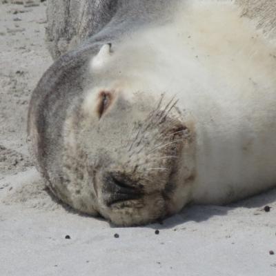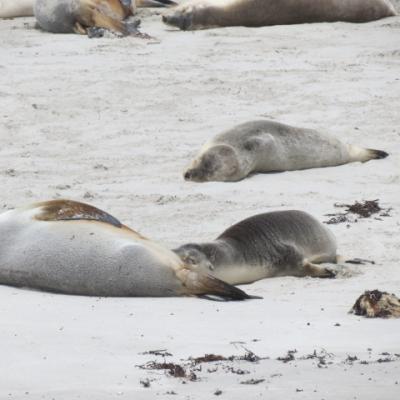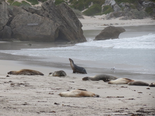 Le premier arrêt est consacré au parc de conservation de Cap Gantheaume, et de Seal Bay. Cette plage abrite une très importante colonie de lions de mer australien. Un garde du parc nous accompagne jusqu’à la plage, nous permettant de marcher sur le sable et nous offrant l’opportunité d’être proche de ces animaux, tout en respectant une distance de sécurité et de bien être pour les lions. Les mamans allaitent leurs bébés, les males pour leur part s’octroyant une pause…