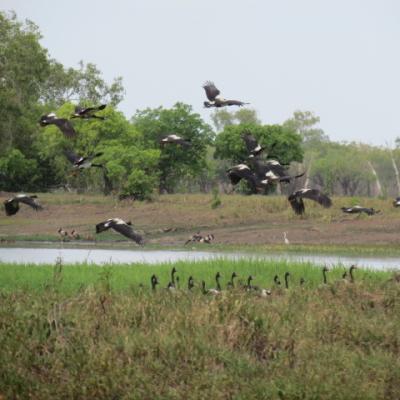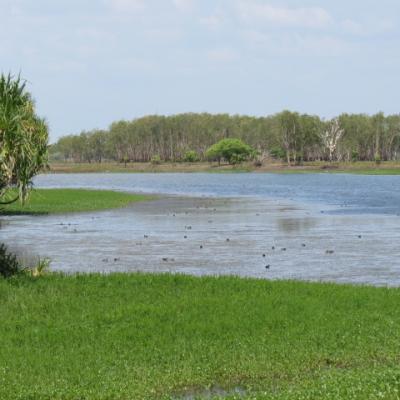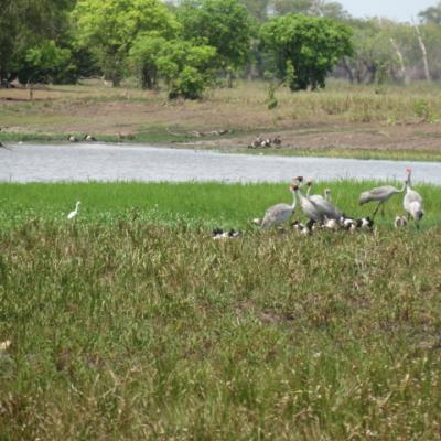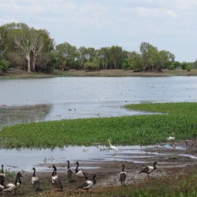 En effet même si nous sommes censé être en cette période de l’année en saison de mousson, donc humide, la pluie se fait attendre et la Yellow Water River est un des rares point d’eau du parc, permettant d’observer la vie sauvage du Kakadu. Nous ne verrons pas aujourd’hui de crocodiles d’eau salée sur cette partie de la rivière mais de nombreuses espèces d’oiseaux tels que les grues brolgas, , les canards siffleurs, les tadornes radjah, martins pêcheurs et hérons, seuls manquent à l’appel les fameux jabiru...une espèce de cigogne de couleur blanche et noire qui a donné son nom au village du parc.