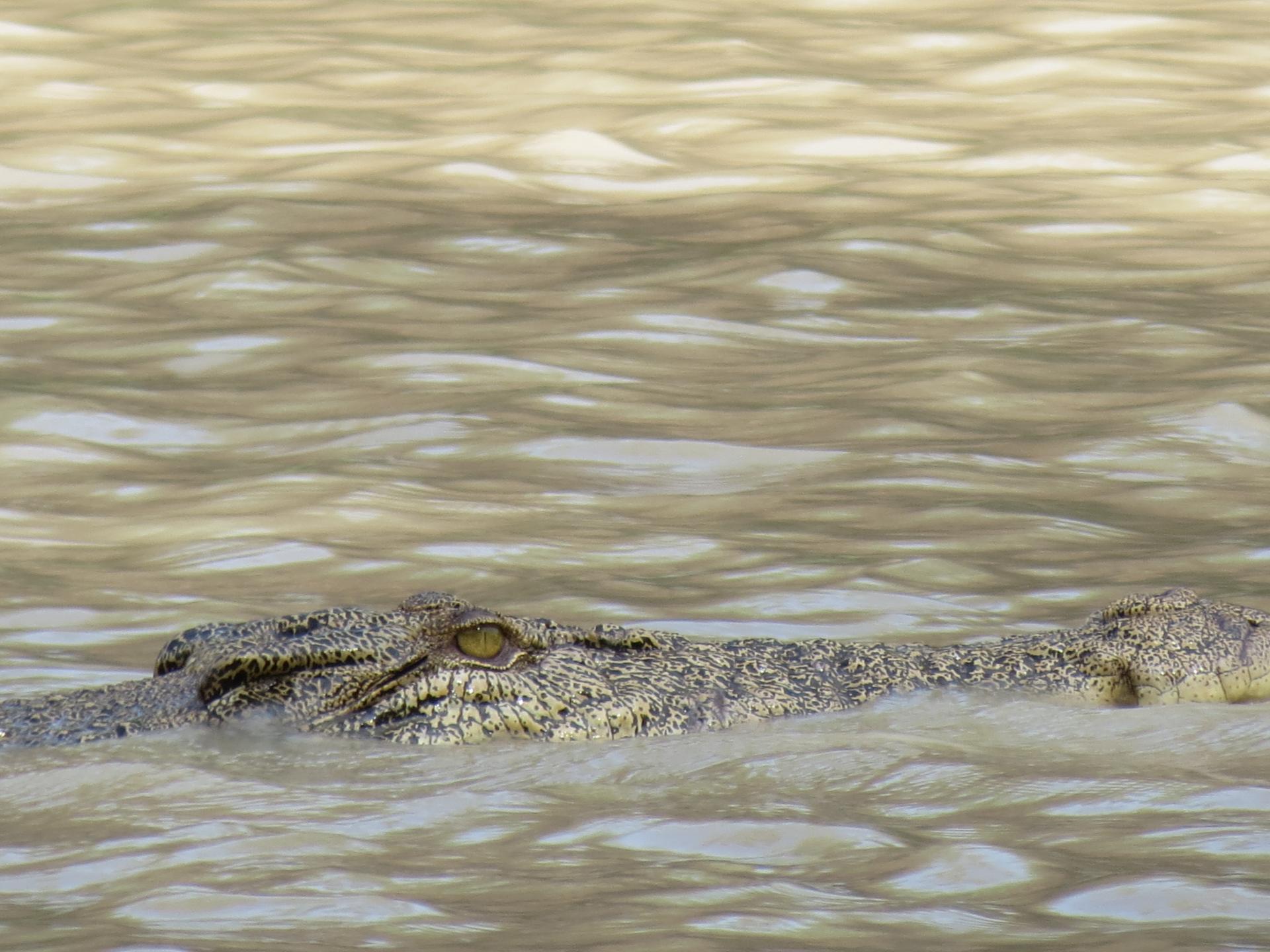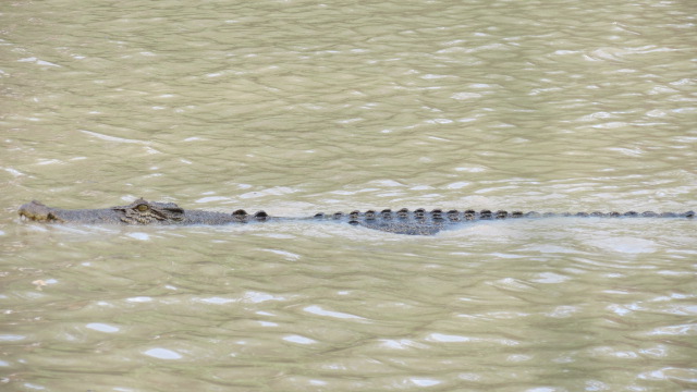 Avant de regagner Jabiru, un dernier arrêt sur les berges de la rivière Alligator la bien nommée ! En effet nous pouvons apercevoir du rivage une vingtaine de beaux spécimens de crocodiles d'eau salée en pleine séance de chasse.