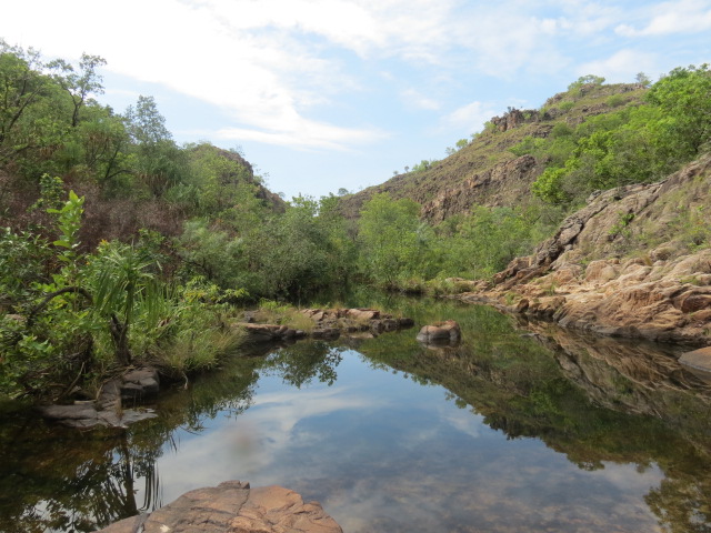 Nous allons passer l’après midi à randonner le long de la Edith River et des cascades d'Edith Falls offrant de nombreuses piscines naturelles propices pour la baignade. C’est un pur régal d’autant plus que la température extérieure doit être proche des 38° degrés et que celle de l’eau proche des 28°C. Après 11 kilomètres de marche et 4 baignades il est temps de regagner la ville de Katherine notre étape pour la nuit située à une quarantaine de kilomètres.