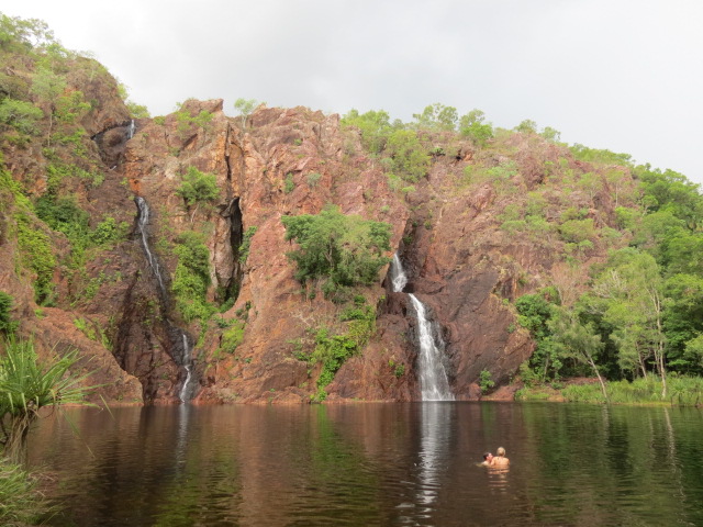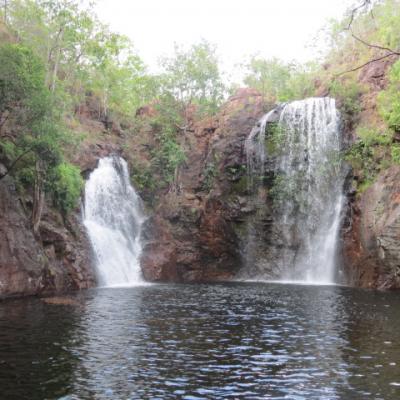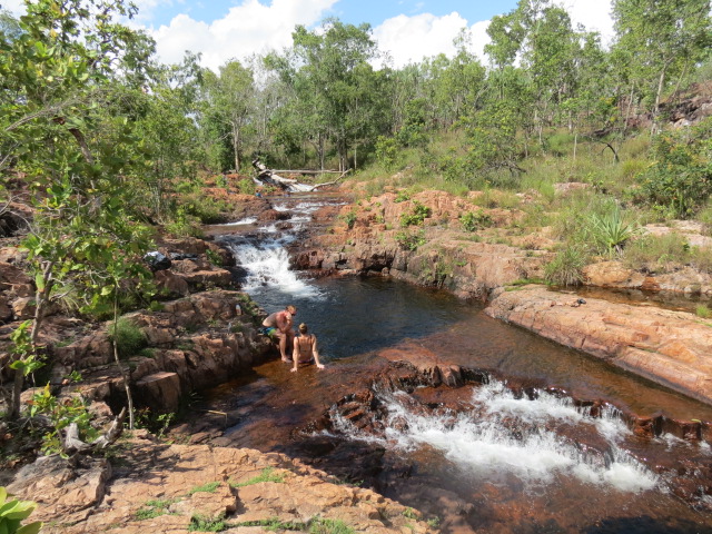 A deux pas se situent les magnifiques cascades de Florence. Après les Catherine, grosses bises aux Florence ! Des chutes de Florence un sentier permet de remonter la rivière et d’atteindre les trous d’eau naturels de Buley Rockhole, piscines naturelles aux eaux cristallines qui se sont formées à la force des courants. De nombreuses familles profitent de cette agréable fin de matinée pour se rafraîchir au bord de la rivière et de ses profonds bassins où l'absence de crocodiles permets de se baigner en toute sécurité. Nous n’allons pas non plus nous priver de nous accorder une courte pause pour nous baigner.