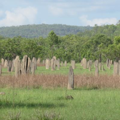 Le premier arrêt proche de l’entrée du parc va nous permettre d’observer un champ de termitières géantes dites magnétiques car elles ont la particularité d’être toutes exposées au nord, limitant ainsi l'expostion au soleil. Certaines sont âgées de plus de cinquante ans et atteignent une hauteur supérieure à 5 mètres. Bien qu'on croirait voir un alignement de menhirs, nous ne sommes pas à Carnac !