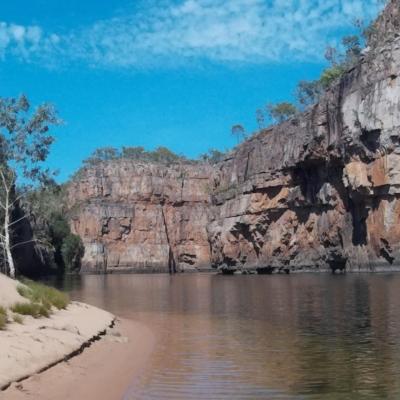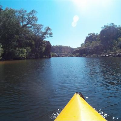. Destination les gorges de Katherine situées à une trentaine de kilomètres. Grosses Bises au passage à toutes les Catherine ! Cathy , Kathy… La Katherine River traverse une enfilade de 13 gorges de grès façonnées au fil des millénaires. Une sortie en canoë de 4 heures va nous permettre d’en apprécier les paysages et d’atteindre les 2 premières gorges à la force de nos pagaies, la troisième en raison du niveau bas de l’eau étant accessible à pied. La partie de la rivière est également sécurisée et c’est un véritable plaisir entre chaque gorge de pouvoir se reposer le long des berges et de se rafraichir dans les eaux tièdes de la rivière.