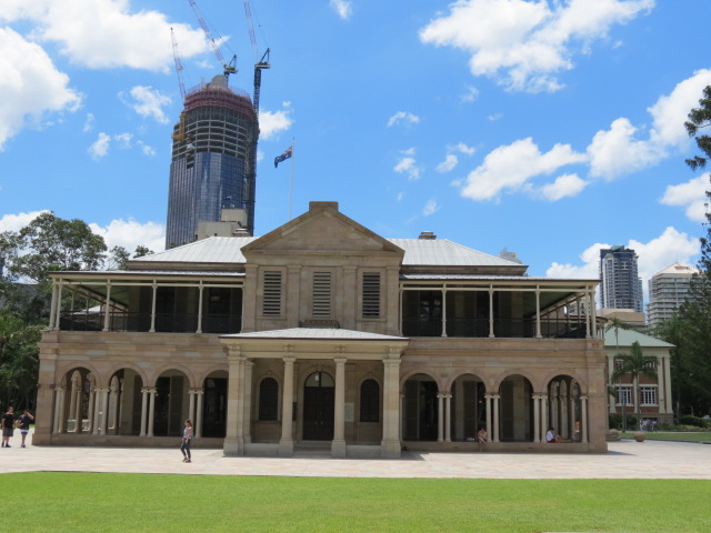 Au niveau du musée maritime, un pont piétonnier permet de revenir sur la rive nord et de rejoindre les jardins botaniques créés au bord du fleuve en 1855, sur l’ancien potager des forçats. Mitoyen du jardin, se situe le quartier historique de Brisbane où sont regroupés la majorité des édifices qui ont échappé à la démolition dans les années 1970. Le parlement achevé en 1868, est toujours en fonction et a la particularité de n’abriter qu’un seul corps législatif contrairement à ceux des autres états australiens. Une rapide visite de la Old Government House (résidence du gouverneur de l’Etat) transformée en salle d’exposition, et du Commissariat Store Muséum, lui aussi étant un des rare bâtiment datant de la colonie pénitentiaire construit en 1829. Le centre de Brisbane est un cocktail de vieux bâtiments élégants, de gratte-ciels élancés et de parcs verdoyants.