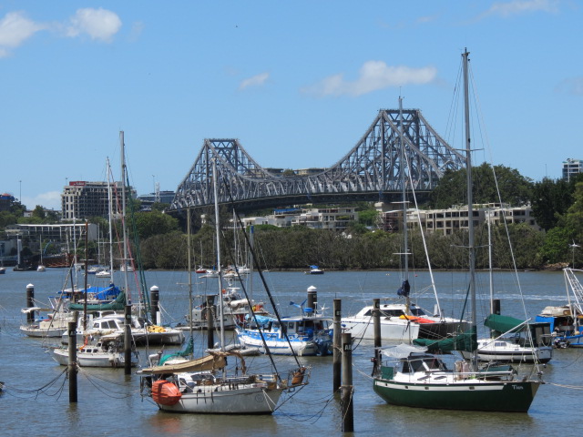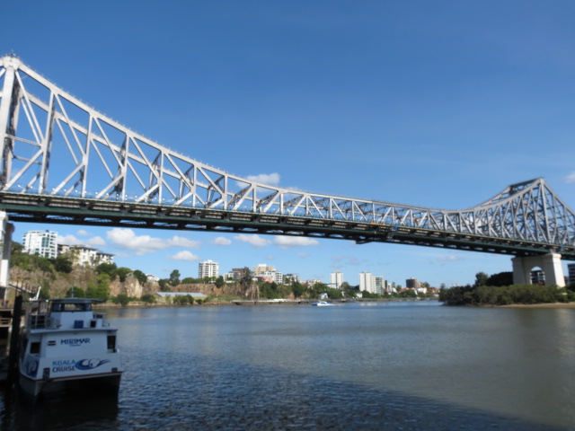 Je me dirige à nouveau vers les rives du fleuve, cette fois ci pour embarquer à bord d’un ferry gratuit qui va me déposer au pied du Story Bridge. Ce pont construit en 1940, fut le premier pont 100% australien, conçu par des australiens avec des matériaux australiens contrairement au Sydney Harbour Bridge par exemple. Le pont peut être escaladé, ou être descendu en rappel, je me contenterai de le traverser. Il est bien entendu moins imposant que celui de Sydney, il n’en demeure que la vue au milieu du pont sur Brisbane et ses quais est imprenable.