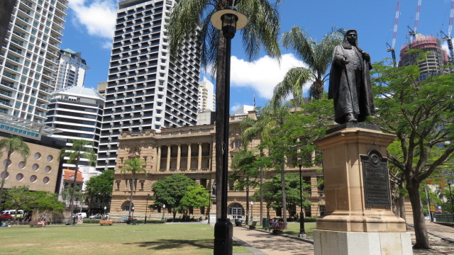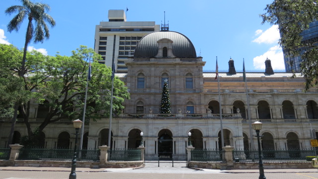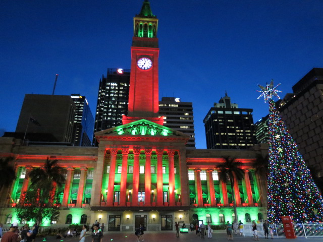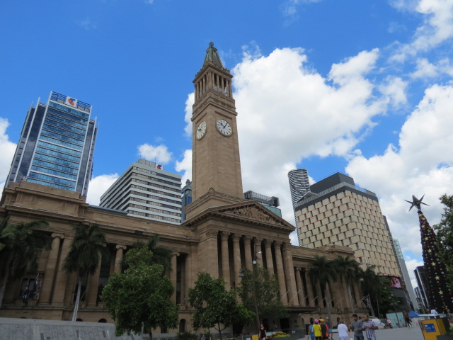 Après cette sympathique matinée au vert, je regagne le centre ville de Brisbane en bus. Arrêt à la mairie de Brisbane pour en savoir plus sur l’histoire de la cité, par la visite du musée de la ville situé au troisième étage du bâtiment. Du musée et sur réservation préalable nous pouvons monter à la tour au moyen d’un ascenseur d’époque pour une vue plongeante sur la ville. La tour haute de 90 mètres était jusqu’au début des années 1960 le bâtiment le plus haut de la ville. Aujourd’hui la vue est désormais masquée par les nombreux immeubles.