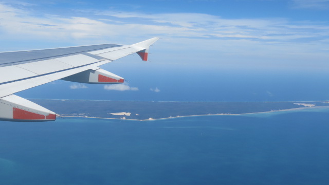 C’est donc une nouvelle journée de transition, avec un vol de 2h30 pour rejoindre Cairns située tout au nord du continent. Je suis toujours un peu frustré de perdre ce temps dans les avions et les aéroports, mais au regard de la taille du pays, cela reste cependant le moyen le plus économique et le plus rapide pour se déplacer. Cela permet également après des journées intenses de visite de faire un break certes forcé, mais nécessaire et de mettre à jour les articles sur le site. Le vol de jour est également très scénique permettant de survoler toute la côte est, et d’en apprécier toute sa beauté avec ses nombreuses iles paradisiaques pour la plus part inhabitées dont la fameuse Fraser Island et la grand barrière de corail. Finalement la journée ne sera pas totalement perdue !
