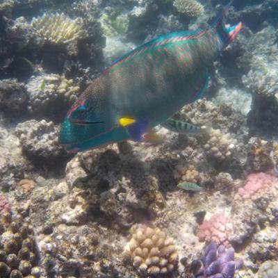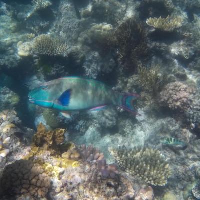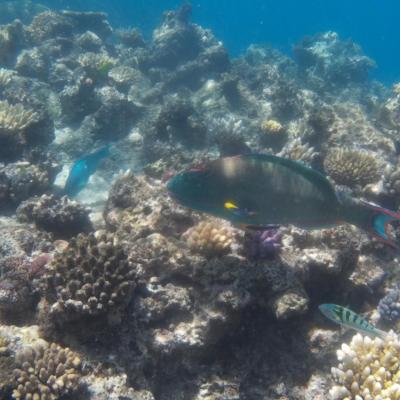 Après la pause repas, le capitaine du vaisseau va déplacer de quelques centaines de mètres le navire. Nous sommes désormais positionné à une centaine de mètres de la ceinture corallienne. Les fonds sont beaucoup moins profonds. La plongée va être beaucoup plus scénique, les fonds sous marins éclairés par un belle lumière du jour sont superbes, la quantité et variété de coraux offrent une véritable palette de couleur de peintre. Pour faire la fine bouche, même si j’ai dû voir à minima une cinquantaine de poissons différents, la faune marine n’est pas présente en grand nombre, et le poisson star du récif, le fameux poisson clown est invisible ! Il faut dire que sur cette partie du récif, il n’y a pas d’anémones de mer, lieu d’habitation de ces fameux Némos ! Nous n’aurons pas non plus la chance de voir des tortues marines, durant notre sortie. Ah le voyageur du monde est exigeant… habitué à voir au quotidien des paysages magnifiques, il n’est jamais rassasié et en demande toujours plus ! Il n’y aura pas aujourd’hui de cerise sur le gâteau, mais la journée a été superbe, nous avons eu la chance de bénéficier de conditions météos exceptionnelles, et d’une mer belle, me laissant en souvenir un joli coup de soleil sur mes cuisses…