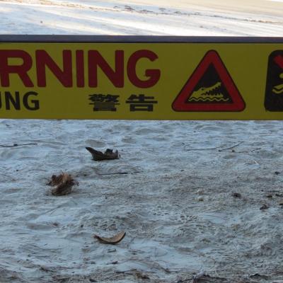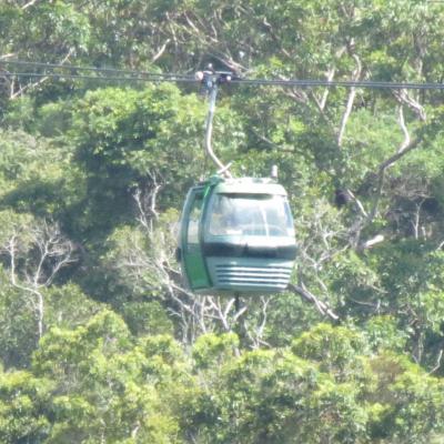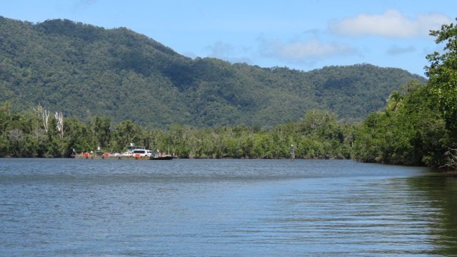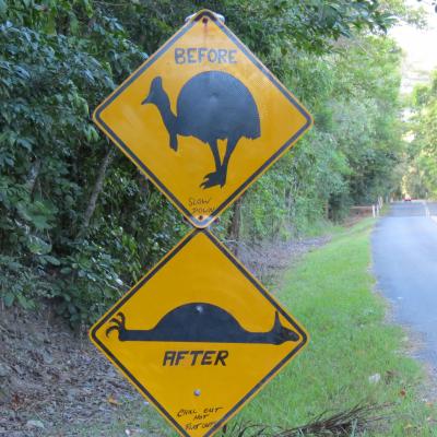 L’entrée du parc est marquée par la traversée de la Daintree River bordée de mangrove à l’aide d’un petit bac guidé par des câbles. La rivière est réputée pour être le refuge de crocodiles d’eau salée et nous ne sommes pas autorisé à quitter le véhicule durant le court passage. Ils sont pourtant invisibles… Nous franchissons la totalité du parc par une route côtière par endroits scénique pour atteindre à son extrémité à Cape Tribulation, 60 km plus au nord. Deux belles plages sont adossées au cap formant de belles baies. Elles ne sont malheureusement pas propices à la baignade, l’une en raison de méduses et l’autre pour être l’habitat de crocodiles… Il n’y aura donc pas de deuxième baignade au cours de cette journée...Nous reprenons la route pour rejoindre Cairns, espérant croiser au détour d’un virage, un de ces fameux casoars, ou bien à défaut un kangourou… hormis les panneaux de signalisation, pour certains parodiés nous n’en verrons même pas la moindre plume…