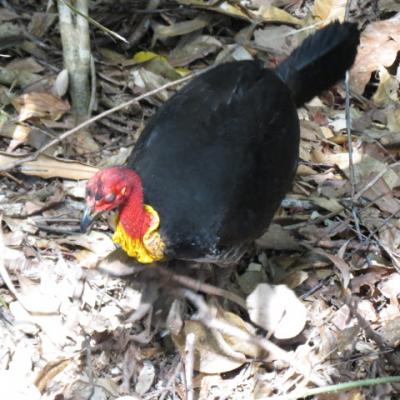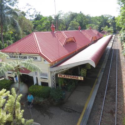 En ce début de matinée, Kuranda ne semble pas être réveillé, et la rue principale bordée de boutiques, de galeries et de magasins d’art est déserte. Kuranda est célèbre pour son marché où sont vendus de nombreux produits typiques du nord du Queensland : miel, café, fruits tropicaux et noix de macadamia. Kuranda est un point idéal pour des promenades en forêt tropicale. Nous rejoignons en voiture la Jungle Walk, qui s'enfonce à travers la forêt tropicale pour atteindre la promenade River Walk en bordure de la rivière Barron. Un chemin en planches, suspendu au-dessus de la forêt permet de rejoindre le point d'observation de Barron Falls en plein cœur du parc national de Barron Gorge. Nous y croisons une dinde du bush (Turkey bush). Les chutes même en cette période de l’année où le débit est au plus bas sont superbes.
