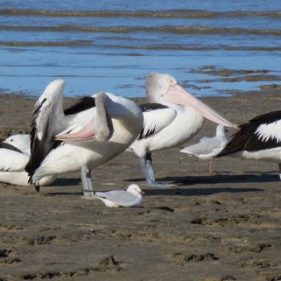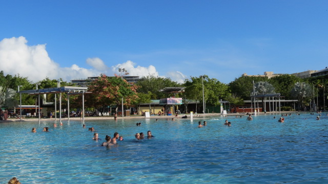 Après avoir pris possession de la chambre que nous partagerons pour les 3 jours à venir, nous nous dirigeons vers le bord de mer tout proche. Une belle promenade, nommée esplanade permet de rejoindre la marina et la piscine lagon aménagée comme à Brisbane, permettant aux touristes et aux habitants de Cairns de se baigner en tout sécurité. Comme sur Darwin, le littoral est peuplé de crocodiles…et peu de plages au nord du Queensland sont propices à la baignade. Une colonie de pélicans a cependant décidé d’occuper la plage La température de l’air est encore supérieure à 30°C en cette fin d’après midi. Nous profitons d’une baignade dans cette immense piscine pour finaliser nos deux prochains jours de visite dans la région.