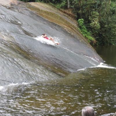 Il a plu toute la nuit, mais par chance la pluie a cessé en ce début de matinée. Le ciel est chargé, et la visibilité sur la baie est très réduite. Je décide de rejoindre le centre de Paraty pour y louer un VTT et mettre à profit cette matinée pour découvrir les alentours de Paraty et la petite bourgade de Cunha réputée pour la chapelle de Notre Dame de Penha, la cascade toboggan et ses distilleries de Cahachaça. Je vais faire une randonnée d’environ 30 kilomètres avec un aller assez physique, tout en montée à l’assaut de la Serra da Bocaina… Je crache toutes les galettes de tapioca et glaces que j’ai pu ingurgité depuis mon arrivée au Brésil, le taux d’humidité est supérieur à 80% et j’arrive trempé au pied de la petite église de Cunha et au départ du sentier du chemin de l’or qui longe la rivière Souza.