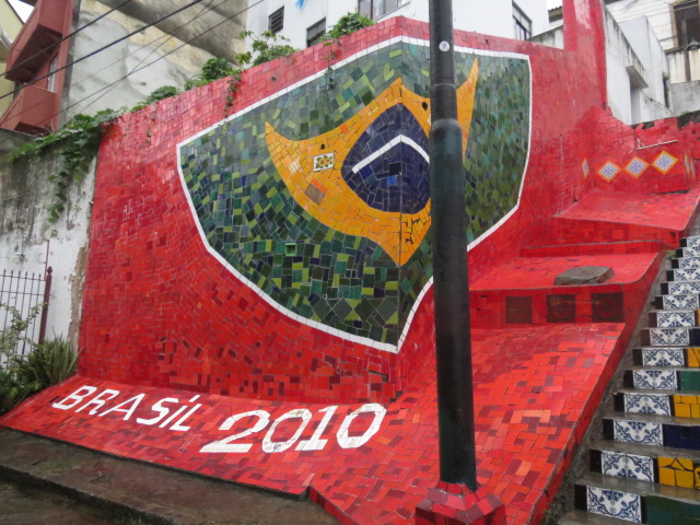 En haut de l’escalier une mosaïque représente le drapeau brésilien. C’est escalier est si populaire à Rio et dans le monde entier que l’escalier a été le décor de nombreux clips musicaux entre autres de Snoop Dog et U2 « Walk on