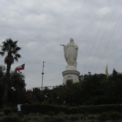 Je quitte le centre ville, rejoint le Mercado Central avec ses beaux étals de fruits de mer et traverse la rivière Mapocho, jalonnée par d'élégants parcs tels le Parque Forestal pour atteindre la colline Cerro San Cristobal. Lieu incontournable pour apprécier le charme de Santiago. Pour y grimper, les plus courageux marcheront tandis que les autres emprunteront le funiculaire. Aujourd’hui il me manque un peu de courage, donc j’embarque dans le funiculaire. La vue panoramique offerte depuis le sommet doit être superbe jour de grand beau temps. Cependant aujourd’hui j’ai un peu de mal a admirer la ville dans son ensemble avec la majestueuse cordillère des Andes en toile le de fond en raison d’un plafond nuageux bas agrémenté certainement d’un zeste de pollution. Au passage, je gravi avec courage une centaine de marches pour atteindre le sanctuaire dédié à l’Immaculée Conception, et son imposante statue de la Vierge Marie qui domine tout Santiago. Bref l’équivalent du Corcovado mais version féminine !