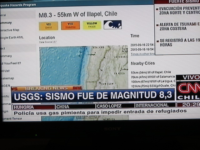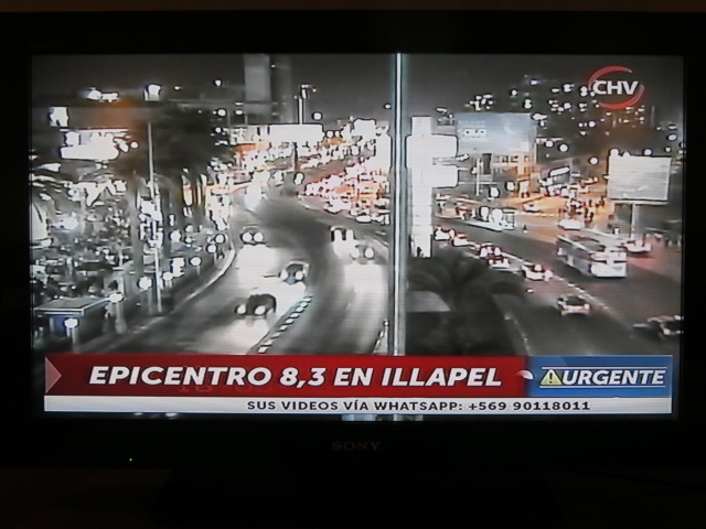 La journée se conclue par une belle frayeur. Il est 19h55, je sort de ma douche lorsqu’un un séisme d’une magnitude de 8,3 sur l’échelle de Richter frappe le Chili. L’épicentre est situé à 220 km de Santiago. Ma chambre se situe au 15ème étage sur les 17 que compte l’hôtel. Portes de penderie, cintres, s’ouvrent ou bougent, serviettes de bain tombent de leur patère, j’ai l’impression de tituber ou de tanguer… c’est le bâtiment tout entier qui assis sur une base anti sismique bouge et absorbe les secousses du séisme qui va durer une grosse minute. Le temps de me remettre de mes émotions, de m’habiller, j’ose quitter ma chambre et regagne après avoir longuement hésité la réception par l’ascenseur. Je suis rejoint par quelques touristes brésiliens assez effrayés, pour ma part je ne suis pas non plus très fier de cette situation. Le personnel de l’hôtel est très calme voire souriant, certes apparemment habitué de ce genre de situation, même si ce séisme semble être le plus important depuis celui de 2010. Je rencontre le directeur de l’hôtel et lui demande quelles sont les précautions à tenir si des répliques viennent à venir. Bien entendu il me rassure sur les normes anti sismique du bâtiment et invite les clients à regagner tranquillement leur chambre, la seule mesure a prendre est d’éventuellement laisser la porte de la chambre ouverte au cas où… Je remonte moyennement rassuré, de ma chambre je peux me rendre compte que la vie sur Santiago suit un cours normal, bus, métro circulent normalement et allume la chaine info chilienne pour suivre les informations relatives au séisme.