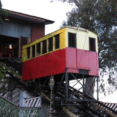 Après m’être attardé à observer les préparatifs de la parade, je me dirige à l’ouest de la ville pour grimper la rue Simpson qui mène à la colline de Polanco desservie également par une tour ascenseur. Le quartier n’est pas très bien fréquenté, je ne m’y attarde pas. Dernière ascension de la matinée pour regagner le mirador Baron, opposé au mirador de l’Artillerie, permettant d’avoir une vue du port et de la baie. Je m’offre une descente pour le fun sur les quais par l’ascenseur Baron classé comme la plus part de ceux en service monuments en service.