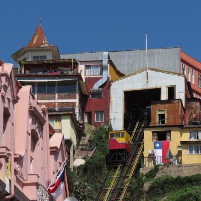 Je continue ma descente par la rue Uriola dont de nombreuses bâtisses sont décorées de belles fresques. Une pause technique à l’hôtel et je repars ! Les journées au Chili sont plus longues qu’au Brésil et c’est également une bonne chose. La nuit ne tombe que vers 19h45, permettant d’optimiser les journées de visite. J’ai donc le temps de prendre l’ascenseur de l’Artillerie situé sur la place des douanes (un des dix ascenseurs en service sur les quinze que compte la ville et dont le prix varie en fonction de la longueur du trajet) et de regagner le mirador du 21 Mai pour admirer le coucher de soleil sur la baie.