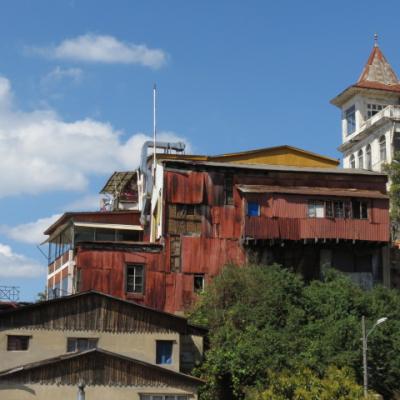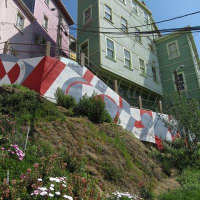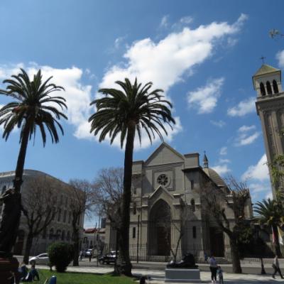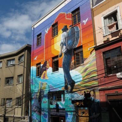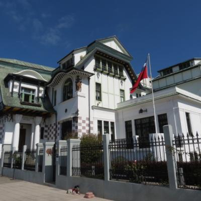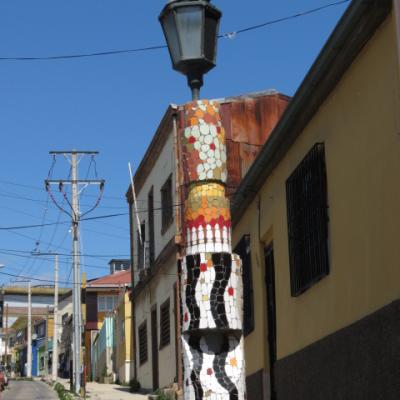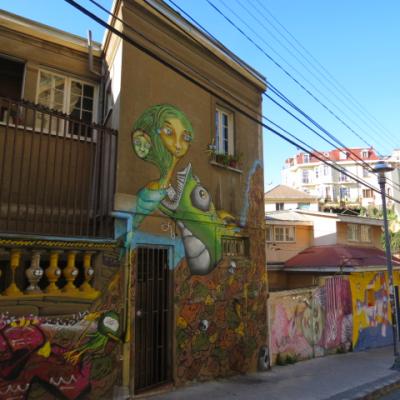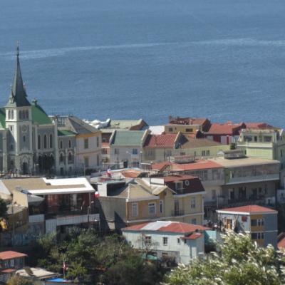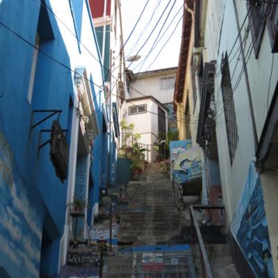 Je passe toute l’après midi a explorer dans un premier temps la ville basse, le port, la place Sotomayor et les grandes artères abritant immeubles administratifs, financiers en majorité reconstruits après le seisme de 1906. Arrivé aux places Bolivar et Victoria, il est temps de débuter mon ascension vers le quartier haut. Quelques marches gravies ardemment et me voici dans les ruelles étroites et tortueuses aux noms biens familiers Pasteur, Chopin, Labruyère dans le quartier de Bellavista où l’on peut admirer le Musée à ciel ouvert, où plus de 20 fresques ont été peintes dans les années 1970. Je continue à gagner de la hauteur par la rue Calvo, passe devant la maison du célèbre poète nobélisé Pablo Néruda pour atteindre l’avenue Alemania. Me voici sur les hauteurs de la ville, l’avenue Alemania permet de jouir grâce à ses nombreux miradors de jolis points de vues sur la ville, ses « cerros » et sa baie. Au niveau de la plazuella San Luis, je commence ma descente par la rue Monte Alegre ou se situe le boulevard Yougoslave et le Palais Baburizza abritant le musée des beaux arts et offrant également un joli point de vue.