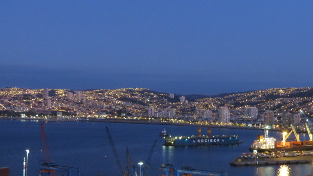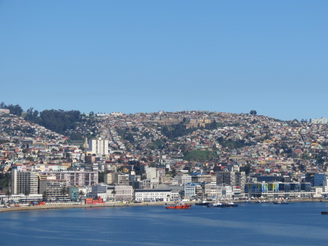 Finalement, j’ai réussi à dormir et paradoxalement passé une assez bonne nuit… Après avoir pris mon petit déjeuner, je me dirige à la réception qui va gentiment contacter l’Ibis de Valparaiso lieu de ma prochaine étape pour prendre des nouvelles de la situation. Bonne nouvelle, la ville a retrouvé une activité normale et l’alerte au tsunami levée dans la nuit. Je peux donc poursuivre la suite de mon périple comme planifié. Je me rends donc à la gare routière. Un bus relie Santiago à Valparaiso tous les quarts d’heures. Deux heures de trajet en bus et 130 km séparent les murs andins de Santiago du majestueux Océan Pacifique. Le parcours le long d’une autoroute moderne est agréable, et à mi-distance après avoir franchi le col, changement de décor et de météo. Je retrouve un paysage et une nature plutôt méditerranéenne avec une magnifique forêt de mimosas qui borde l’autoroute me rappelant la Côte d’Azur et un beau ciel bleu. La ville de Valparaiso apparait avec son labyrinthe de maisons encastrées sur des dizaines de collines ayant vue sur la mer. Me voici donc arrivé dans la ville surnommée la perle du Pacifique, célèbre pour son port et dont le centre historique fut déclaré Patrimoine Mondial par l’Unesco en raison de son importance architecturale et culturelle. Valparaíso (Valpo ou Pancho comme la surnomme ses habitants) reste une ville indescriptible avec son port, le plus important du Chili, dont les origines remontent à 1536. L’hôtel que je rejoint dans un trolleybus électrique datant de 1953, se trouve d’ailleurs face au port et ma chambre dispose d’une magnifique vue sur le port et la baie.