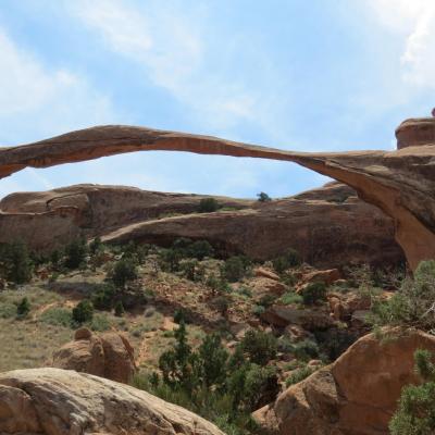 Je me dirige directement au bout du parc à 18 kilomètres pour aller voir cette fameuse Landscape Arch. (avant qu’elle se casse définitivement la g….). Elle se trouve dans les Devils Garden (jardins du diable). Elle ne se voit pas de la route et il faut prendre un chemin à travers ces fameux jardins ! Je fais donc une randonnée de 7 kilomètres à la découverte de cette fameuse arche. Elle est en effet magique, se succèdent sur un chemin un peu plus escarpé la Partition Arch et la Navaro Arch.