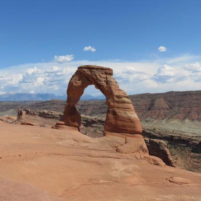 Delicate Arch vestige isolé d’une crête ancienne, s’élève au bord d’un canyon, se découpant de façon spectaculaire et majestueuse, sur la toile de fond que forment les montagnes La Sal.