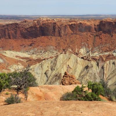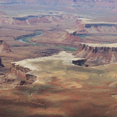 Le premier que je visite dans la matinée est le Parc National de Canyonlands. Ce vaste parc se divise en trois parties distinctes créées par la Green River et le fleuve Colorado. Sur les conseils du ranger, je visite la partie la plus haute située à environ 1800 mètres appelée Island in the Sky. (Ile dans le ciel) bordée par de profonds canyons. Route scénique d’environ 16 miles, mais qui nécessite de quitter son véhicule, pour se rendre sur les belvédères ou de petits sentiers de randonnés, pour admirer panoramas sur les canyons, la belle Mesa Arch ou le cratère géant de l’Upheaval Dome de plus de 4 km de diamètre et d’une profondeur de 360 mètres. Un impact d’une météorite en serait à l’origine. Les 2 autres parties du parc nécessitent locations de tentes et randos de 2 jours minimum