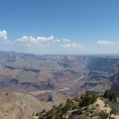 Arrivé au centre du village, je n’ai plus le choix. Je dois garer mon véhicule et prendre une navette pour me diriger à l’autre extrémité du parc : Hermist Rest. La navette longe la rive sud mais il est difficile cependant d’en apprécier le paysage. Sur le chemin du retour je descends de la navette au belvédère de Mohave pour longer le Rim Trail à pied (sentier de la rive) sur les 8 derniers kilomètres. La vue vers l’ouest sur le Colorado et le canyon est imprenable. Le sentier est agréable, et peu de visiteurs prennent le temps de découvrir le cayon en marchant.