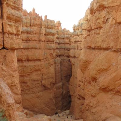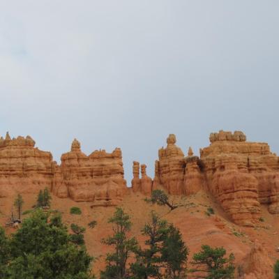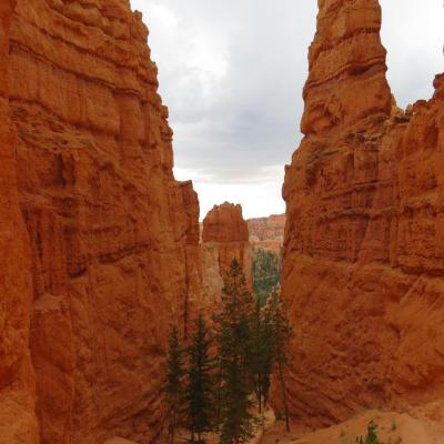 Le temps change en montant sur Bryce Canyon, les nuages s’amoncellent et la température baisse sensiblement. Il ne fait plus que 80° F et c’est pas plus mal pour ma prochaine mini randonnée au cœur des Hoodoos ! Ces Hoodoos sont ces fameuses aiguilles et tourelles rocheuses qui tapissent le canyon.