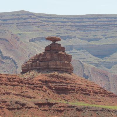 Je reprends la nationale en direction donc de Monument Valley, la route bitumée se transforme en route carrossable sur 3 kilomètres avec une forte descente ayant un pourcentage supérieur à 10%. La vue est grandiose, j’ai tout de même un peu le vertige et peur de me foutre dans le ravin ! Arrivé dans la vallée, nous voici en terre Navajo. Je traverse un semblant de village appelé Mexican Hat (chapeau mexicain, ou sombréro si vous préférez) et en passant devant le rocher ci après je comprends pourquoi !