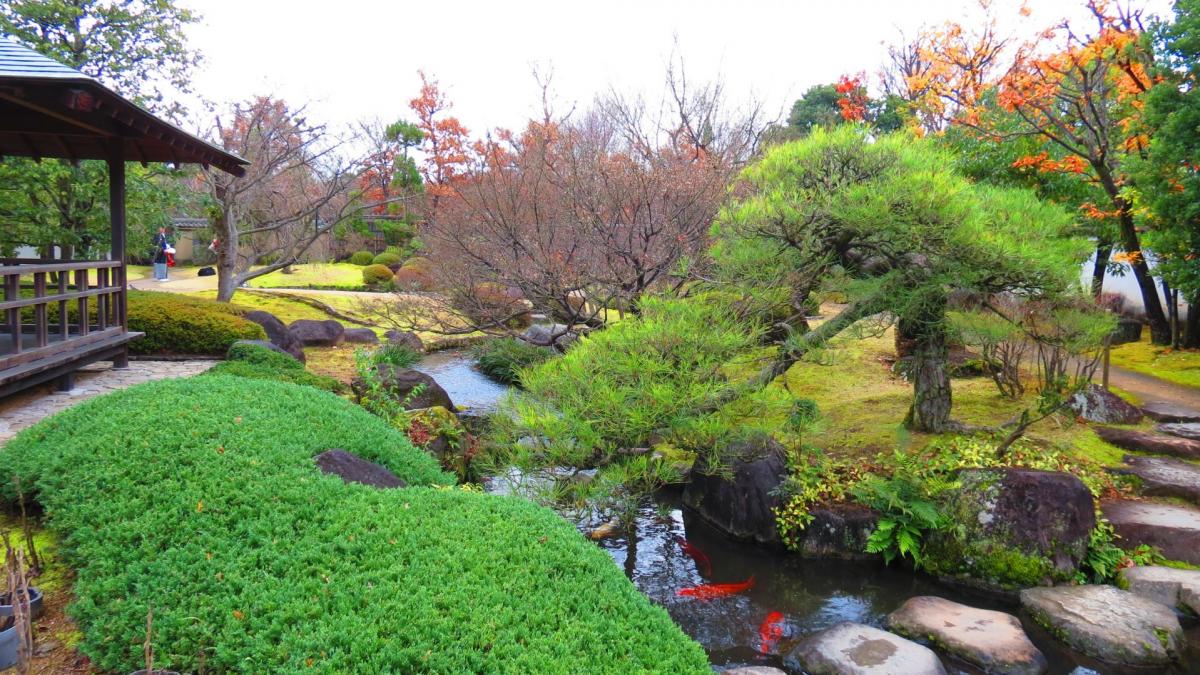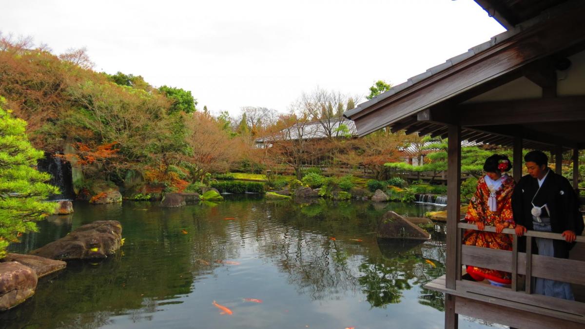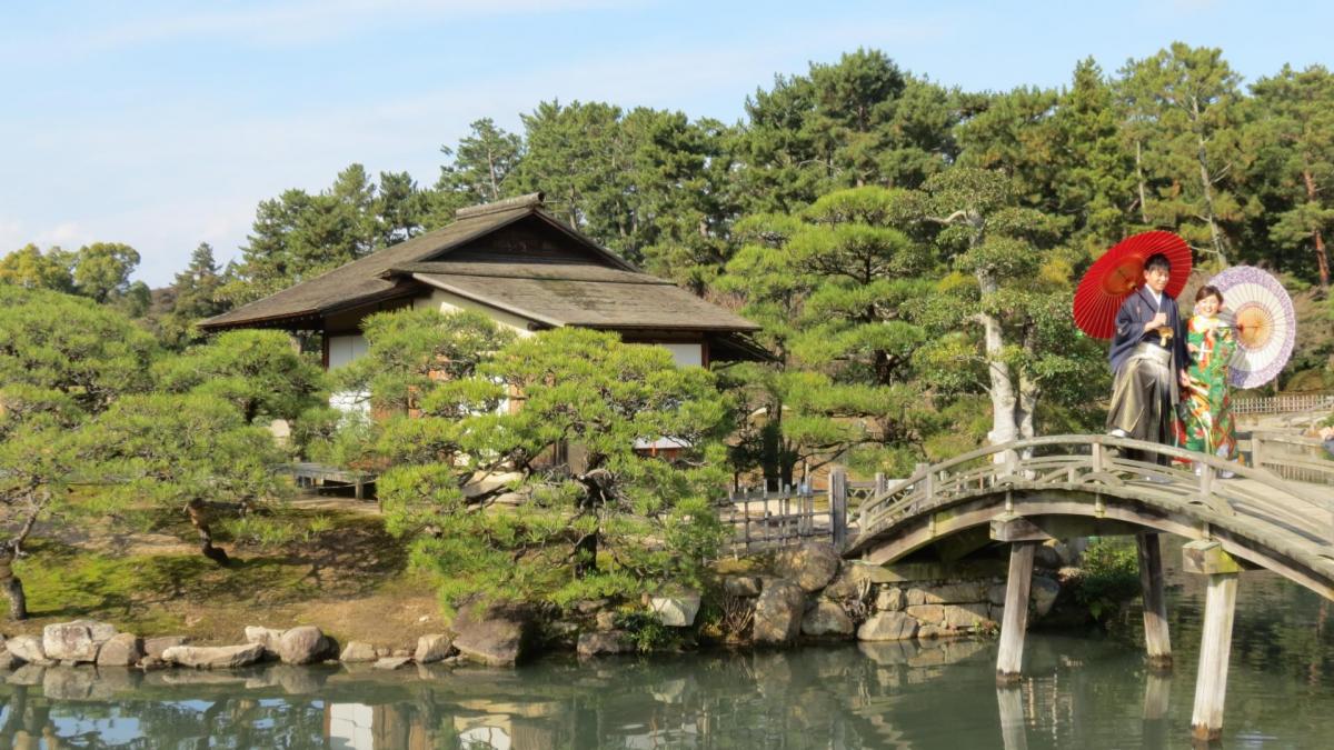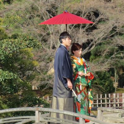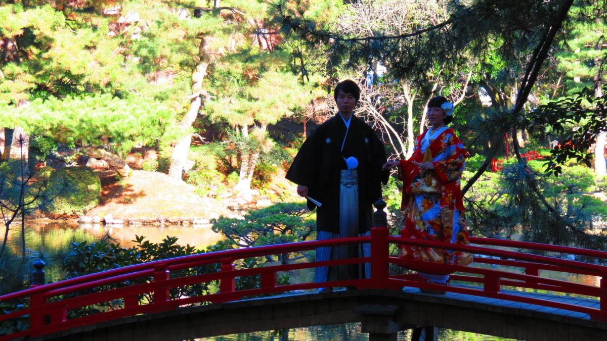 Mais là force est de constater que le jardin en plein décembre n’a pas grand intérêt, à mon goût trop terne en raison de ses nombreuses pelouses à l’herbe jaunie par le gel, pelouses que je n’avais pas vu sur d’autres jardins. Bref la visite se révèle fort décevante d’autant plus sous une belle journée ensoleillée. Je suis surpris que ce jardin puisse être classé parmi les trois plus beaux jardins du pays. Certainement quelque chose doit m’échapper. Dans tous les cas comme la veille à Hiroshima, il reste un lieu de prédilection pour photographes de jeunes mariés en costumes traditionnels.