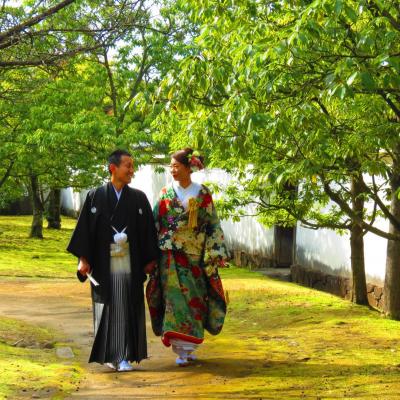 Je continue ma visite d’Himeji par les Jardins Kokoen situés au pied des douves du château. Ils sont vraiment superbes et m’enchantent plus que ceux visités la veille à Okayama. Les jardins sont récents construits en 1992 sur le site où s'élevaient autrefois une demeure du seigneur de Himeji et les maisons des Samurai qui étaient ses vassaux. De nombreux couples de jeunes ou moins jeunes mariés posent dans l’un des neuf jardins traditionnels japonais thématisés qui composent l’ensemble et offrent par endroit une belle vue sur le château.
