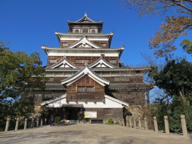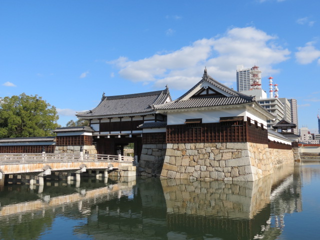 Après cette séquence assez émotive, je continue ma visite des sites d’intérêt d’Hiroshima. Ils sont assez regroupés, rendant la visite de la ville facile et plaisante. Direction le château. Egalement appelé « Rijo » (le château-carpe car l'extérieur, peint en noir, ressemblerait à une carpe noire), il fut construit au 16e siècle par le seigneur de la région, Mori Terumoto. Détruit en 1945, il fut reconstruit à l'identique en 1958. Le donjon à cinq niveaux sert aujourd'hui de musée sur l'histoire et la culture de Hiroshima et le château et ses alentours sont un parc public.