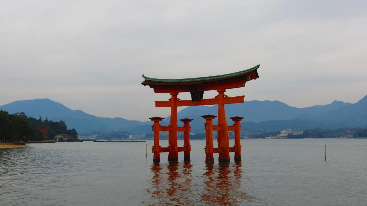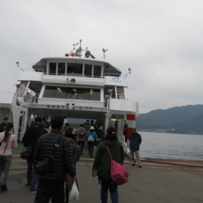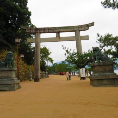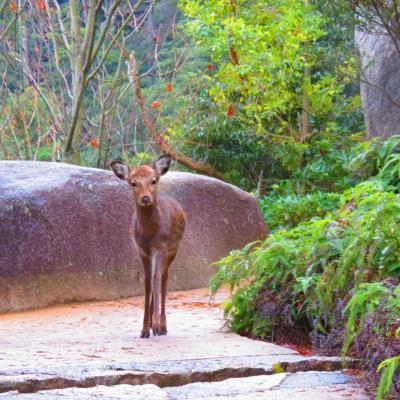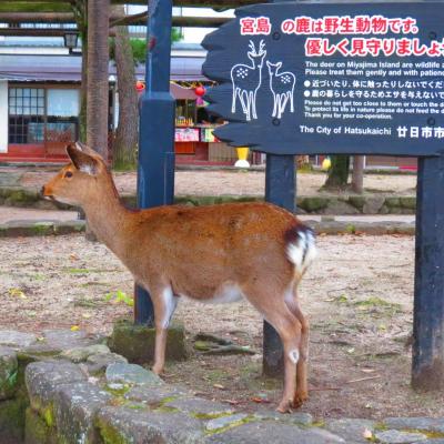 « L'île où cohabitent les hommes et les dieux » est depuis longtemps un lieu sacré, puisque la sanctuaire de Itsukushima y est établi depuis 593 (mais les bâtiments datent du 12e siècle). Ce sanctuaire, dédié à la déesse gardienne des mers, a pour particularité d'être en partie construit dans la mer, avec des bâtiments sur pilotis et son torii à quelques dizaines de mètres au large. Les paysages magnifiques de l'île, ses belles plages ou ses sentiers de randonnée en font une destination appréciée en été. Mais l'automne ou le printemps y ont également de grands charmes, que ce soit avec les érables flamboyants ou avec les cerisiers en fleurs, mais en ce jour d’hiver gris et pluvieux, l’île n’a pas la possibilité de mettre tous ses atouts en avant pour charmer les touristes. C'est cependant pour toutes ces beautés que l'île de Miyajima a été classée au patrimoine mondial de l'Unesco. Je suis surpris en sortant du port de voir comme à Nara, de nombreux cervidés sur la place principale et le long de la promenade longeant la mer. Ces derniers sont encore moins farouches et moins bien éduqués qu’à Nara, un cerf vient me manger le plan de l’île que je tiens dans mes mains sans aucuns scrupules ! Par chance j’en ai un deuxième..