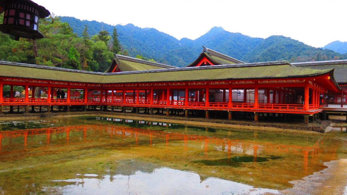 Faisant face, le Sanctuaire de Itsukushima est composé du sanctuaire principal et de plusieurs sanctuaires secondaires et autres bâtiments reliés entre eux par de vastes pontons et galeries. L'ensemble s'étend sur la mer de chaque côté du sanctuaire et à marée haute, l'édifice semble flotter sur l'eau.