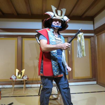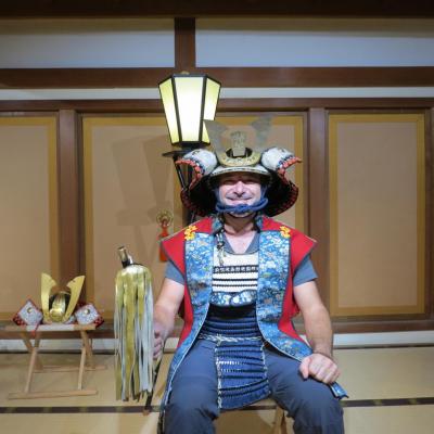 Ce château date de la seconde moitié du 16e siècle et fut la résidence de la famille Ikeda qui contrôlait la région. Le grand donjon à quatre étage a été détruit pendant la dernière guerre et reconstruit en 1966. C'est aujourd'hui un musée de l'histoire locale. Du dernier étage, on a une belle vue sur la ville. Le château d'Okayama est connu sous le nom de Ujo, ou Château du corbeau, car il est entièrement peint en noir. Bon la visite du château reste aussi assez décevante, l’intérieur du donjon étant pratiquement vide, je m’attarde à me déguiser en samouraï pour le plus grand plaisir d’admiratrices japonaises… et pour une photo souvenir.