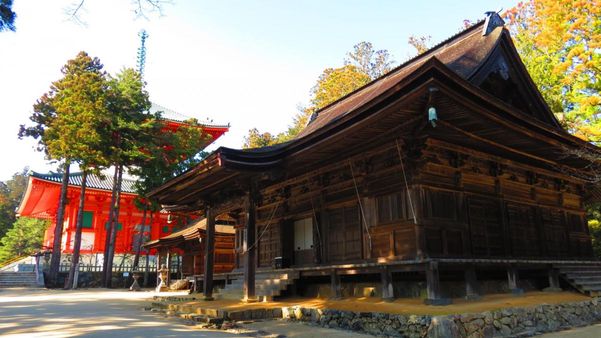 Quelques centaines de mètres de plus et voici le complexe bouddhique du Danjo Garan. Ce site réunit plusieurs bâtiments. Le Kondo (Hall d’Or) a été édifié par Kukai en 819 (et reconstruit plusieurs fois depuis) et est le lieu d'importantes cérémonies religieuses. Le Miedo est reconnaissable à sa toiture d'une grande élégance. Le Konpon-Daito est une pagode laquée de vermillon de près de 50m de haut.