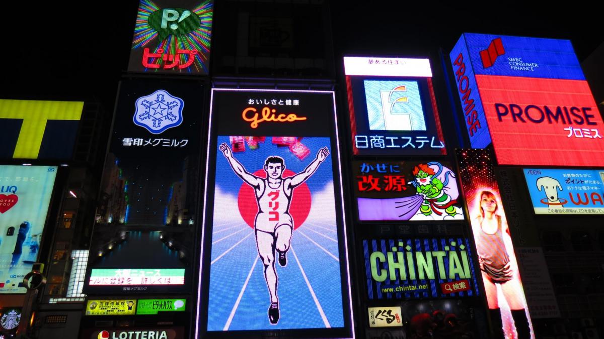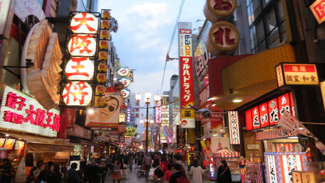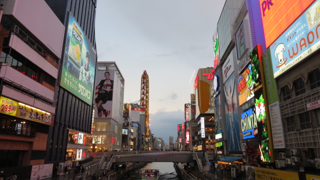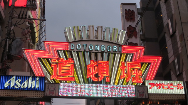C’est mon-avant dernière étape avant mon retour pour Tokyo. J’ai choisi de séjourner au sud d’Osaka au cœur du quartier de Dotonbori, quartier commerçant et de vie pour noctambules par excellence et facilement accessible en métro. Dotonbori est réputé pour ses rues piétonnes longeant le canal du même nom âgé de 400 ans et de ses immenses panneaux publicitaires illuminés se reflétant sur ses eaux. Le panneau du coureur de la marque Glico est un des incontournables du quartier et image iconique d'Osaka. Pour les gourmands Glico est une célèbre marque de biscuits japonaise, celle qui a créé les fameux « Mikados » ! Au Japon, les mikados au thé vert sont incontournables…