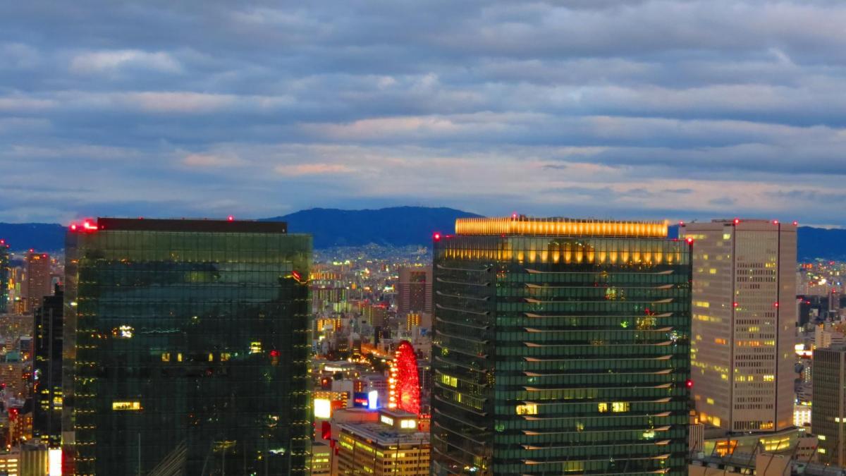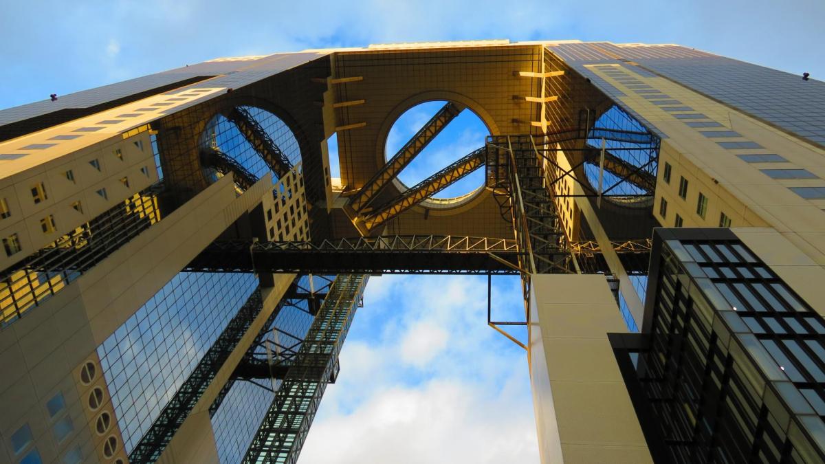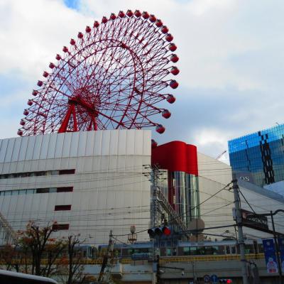 Bon après cette pause romantique il faut désormais trouver mon chemin pour rejoindre avant la tombée de la nuit le futuriste Umeda Sky Building. Bien que ce dernier atteigne les 170 mètres, croyez moi, ce n’est pas chose aisée à le trouver. Je suis à nouveau perdu, noyé autour de tous ces grattes ciels et centres commerciaux dont le Hep Five et sa grande roue rouge de 106 mètres installée à son sommet ravissant certainement les amateurs de sensation forte. Il n’est vraiment pas facile de se déplacer dans Osaka, avec comme souvent des panneaux uniquement en japonais. Vous me direz c’est normal, c’est bien le cas en France… Vous avez raison… mais quid des touristes occidentaux ???