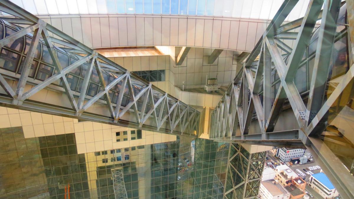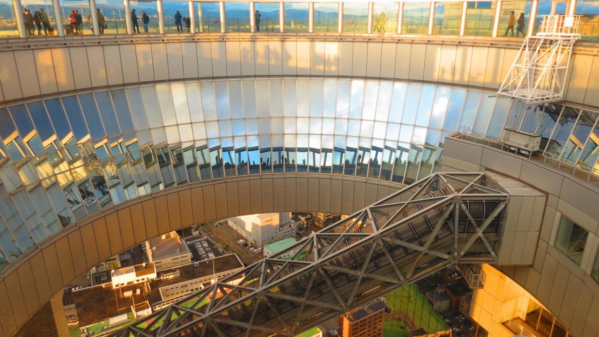 Bon revenons à notre tour. Et je l’ai enfin trouvée ! Œuvre de l'architecte Hiroshi Hara, ce gratte ciel est classé parmi les vingt plus beaux gratte ciel et tours du monde. C’est en fait deux tours jumelles reliées par un jardin flottant au 39e étage, à 173 mètres du sol, une plate-forme ouverte offrant une vue à 360°. On y accède par un ascenseur extérieur puis une passerelle donnant l'impression d'être suspendu dans le vide au-dessus de la ville. L’accès est vraiment exceptionnel et unique. Moi qui suis pourtant sujet au vertige, je suis bluffé. La vue de la plate forme est en effet imprenable sur la ville, le port d'Osaka et les montagnes de Ikoma, d’autant que le pont d’observation est totalement ouvert et qu’il n’y aucunes vitres ou grillage pour gâcher les prises de vues.