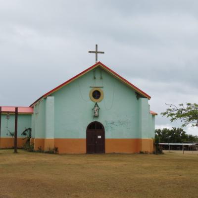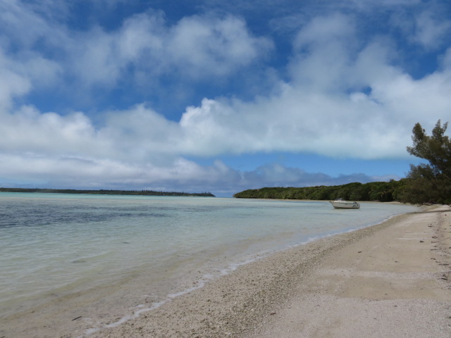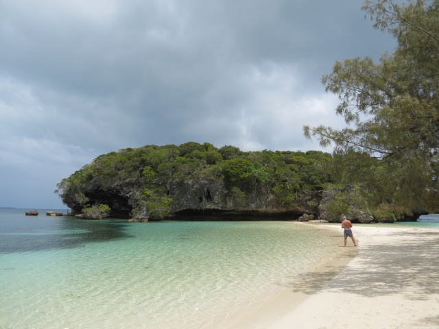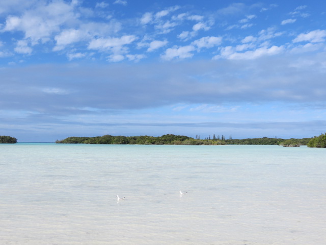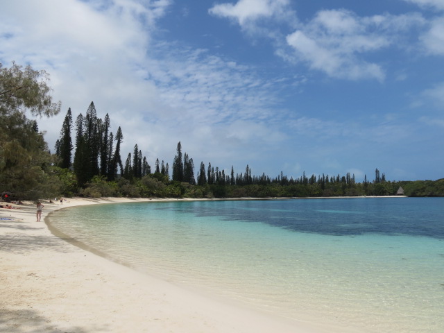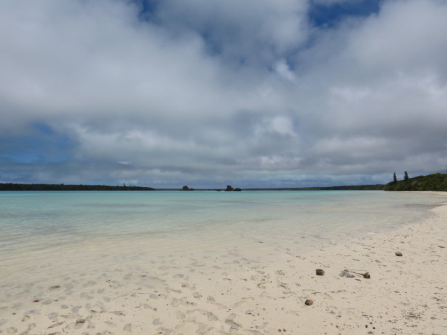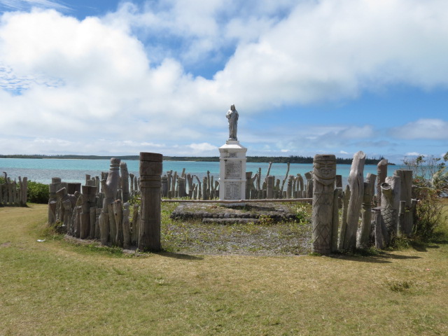 Direction la baie de Kuto, située à deux pas de ma case. Premier arrêt sur la plage. Je n’avais jamais vu jusqu’à présent de sable aussi blanc et aussi fin. On pourrait le comparer à du talc ou de la farine… J’ai la mauvaise surprise de voir un paquebot dans la baie désembarquer deux milliers de passagers australiens au niveau de l’embarcadère, soit pratiquement autant que les 2400 habitants de l’ile ! Je me dirige à présent vers Vao, le principal village de l’ile, abritant les principaux services de l’ile (mairie, collège, dispensaire). Entre deux bus d’australiens, j’arrive toutefois à prendre quelques clichés de l’église Notre Dame de l’Assomption, et de la plage de la baie Saint Maurice ou une statue commémore la première messe célébrée sur l’ile. Elle est entourée d’une palissade de totems sculptés par tous les clans.