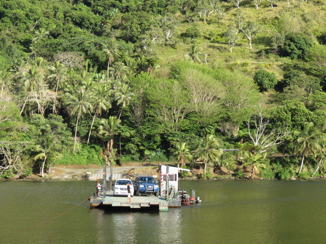 Je me réveille avec le lever du soleil, une rapide toilette et je reprends la route vers le nord en direction de Pouébo, n’ayant pu la voir la veille en raison de la nuit tombée. La route est tout simplement splendide, de nombreux belvédères aménagés permettent d’admirer de magnifiques points de vue sur la baie de Hienghène, célèbre pour ses formations rocheuses spectaculaires, sa poule couveuse, faisant face au sphinx. La météo en ce début de matinée est agréable augurant d’une journée relativement ensoleillée. Je traverse à nouveau mais cette fois ci sous un magnifique soleil et lumière la rivière Ouaième avec le bac de Ouaième, dernier bac en service sur la Nouvelle Calédonie, fonctionnant 24h sur 24h et totalement gratuit évoluant dans un décor grandiose.