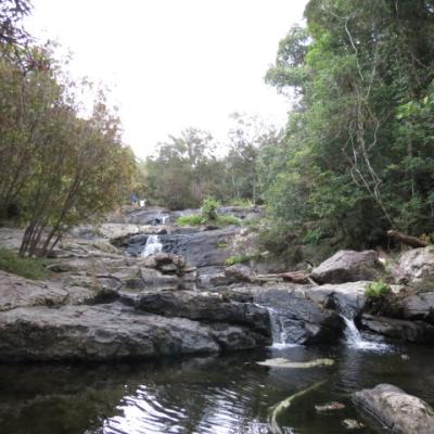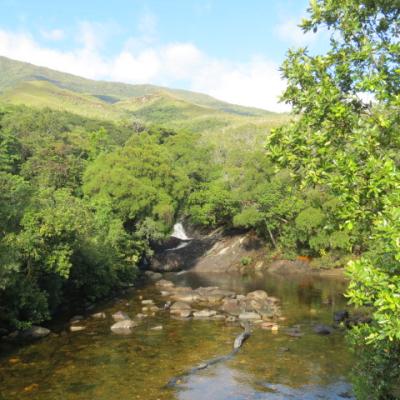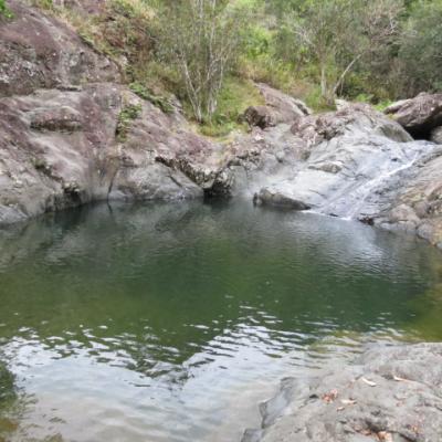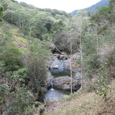 Je traverse l’ile à présent l’ile d’Est en Ouest , afin de regagner au niveau de la ville de Boulouparis la route nationale numéro un, l’artère principale de l’ile reliant Plum au sud à Poum au nord ! Je reprend la direction du nord sur une trentaine de kilomètres afin de regagner les villages touristiques de Sarraméa et de Faréno où j’aurai des chances de trouver un hébergement pour la nuit. Bonne pioche, je m’arrête en fin de matinée dans la grosse bourgade de La Foa où je repère un hôtel en bord de nationale. Il reste une chambre de routard, avec toilettes communes et douches communes. Voilà une bonne chose de faite… Je rejoins à présent le village de Sarraméa célèbre pour ses cultures de café, sa grande case tribale au sein de la tribu de Petit Couli. Par malchance, il s’avère que la case a été incendiée le week-end dernier… un règlement de compte entre tribu… ? Je continue donc ma route en direction du point de départ du sentier de randonnée du plateau de Dogny permettant d’observer par beau temps les deux côtes… Je ne ferai pas la randonnée de 16 km bien trop difficile, mais également en raison de l’heure tardive et des conditions météos pessimistes. Je vais me contenter de marcher sur un petit kilomètre afin d’arriver à un trou d’eau appelé « la Cuve » ou « Trou Feillet », car le gouverneur Feillet de l’époque des colons aimait y faire trempette ! L’eau aujourd’hui est cependant un peu fraîche à mon gout pour la baignade.