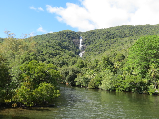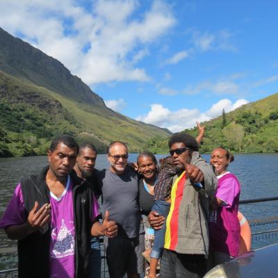 Je remonte donc la route sur une trentaine de km, de nombreuses cascades sont visibles du bord de la route dont la cascade de Colnett offrant plusieurs trous d’eau pour la baignade. Cependant la plus célèbre est la cascade de Tao avec des chutes d’une longueur supérieure à 100 mètres et dominées par le mont Panier culminant à 1628 mètres. Je tire le portrait à une famille Kanak avec la cascade en arrière plan. Une des sœurs vit en métropole et passe ses vacances sur l’ile, et le frère a vécu quelques années en région toulousaine… Je vais les retrouver un peu plus tard à bord du petit bac nous permettant de redescendre sur Hienghène.