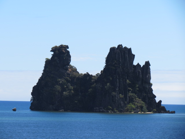 Je ne m’éternise pas non plus sur la plage… et décide de rejoindre la côte est. La route est belle de couleur rouge , après avoir perdu mon chemin dans le village de Ouéga, où un des passes temps favoris des tribus locales est d’enlever les panneaux de signalisation, je franchis le col d’Amos marquant la séparation des côtes ouest et est sous une forte averse. La fin de journée approche et il est temps de songer à trouver un hébergement. Chose non aisée, car il n’y a pas d’hôtel, les gites sont complets tous comme l’accueil en tribu, en raison des vacances scolaires sur l’ile et de 4 mariages dans la ville de Pouébo. La nuit est tombée, je descends jusqu’à la prochaine ville Hienghène accessible en traversant le bac de Oauième.