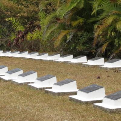 La fin de journée approche, tout comme ma descente sur Kuto. Deux arrêts s’imposent avant de regagner ma case ! Le cimetière des déportés suivi des vestiges du bagne, où se sont succédés 3000 communards de Paris en 1872, puis des prisonniers français exilés jusqu’en 1912. L‘ancien château d’eau construit en 1894 est toujours aujourd’hui en service.